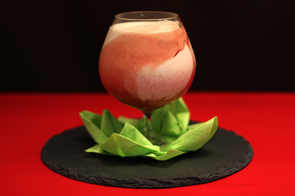 Put all ingredients in a blender and blend to a smooth consistency. Pour mixture into a glass coated on the inside with raspberry sauce.